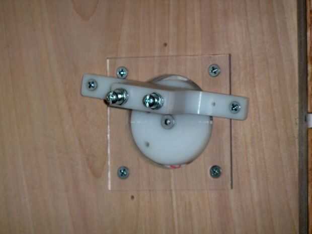 Coloque la placa frontal sobre el vaso con los dos agujeros que significó para los pasadores de seguridad que detenga el tambor gire en la parte superior de la puerta e inserte un sin comprimir 6-32 tuerca de remache de aluminio en a través del orificio del centro en la placa delantera y en el vaso del. Asegúrese de que el tambor puede girar libremente. Tornillo de la placa frontal a la parte posterior de la puerta con el vaso de atrapado en el interior.
