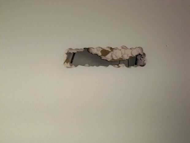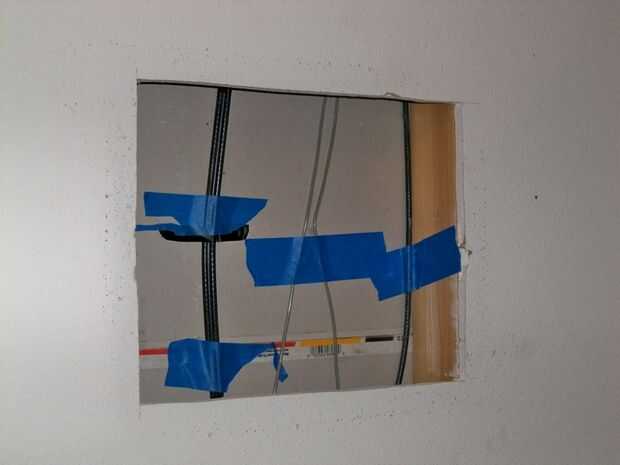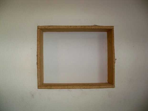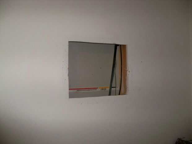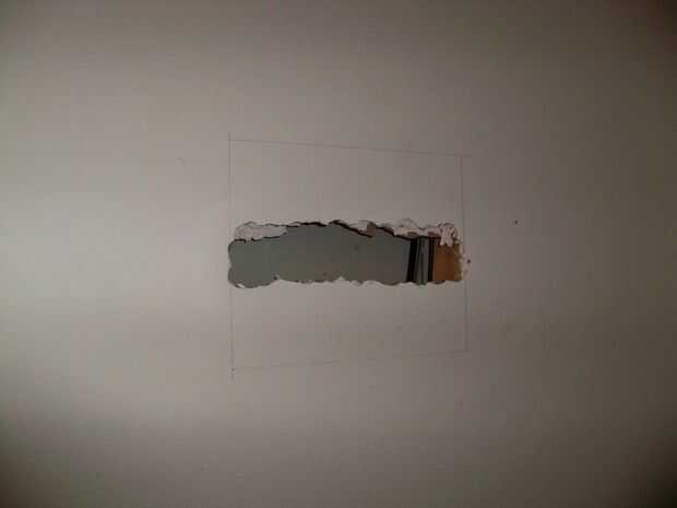 Comenzó con un martillo, luego usa un nivel y un lápiz para marcar la sección que necesitaba cortar. Entonces después de grabar el cableado a un lado usé una sierra de calar para cortar en las líneas, asegúrese de parar antes de llegar cerca de los cables y moverlos a otro lado. Estos no eran eléctricos, solo por cable y teléfono. Limpiar los bordes con un cuchillo. Recuerde lo que dije sobre los peligros de abrir paredes con martillos y herramientas eléctricas.