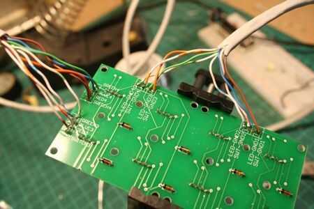 Instalar los LEDs en la orientación indicada por la pantalla de seda. Cuidadosamente empujarlos hacia abajo en el tablero hasta insertarlos como esto. Si les dejas que pegan para arriba demasiado alto, le interfieren con los botones del teclado son empujados.