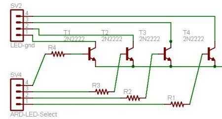 Para los autobuses de LED de tierra, utilizaremos cuatro transistores 2N2222. El Arduino activará cada transistor individualmente a través de un resistor de 1Kohm. El colector de cada transistor se conecta a una línea de tierra desde el teclado. El emisor de cada transistor está conectado a la tierra. Las líneas de seleccionar cuatro transistores conectan a los pines de Arduino 0, 1, 2 y 3. Sí, que están marcado análogo en, pero no importa.