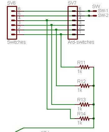 Pines de Arduino 6, 7, 8 y 9 deben conectar a las líneas de cuatro salida marcada SWT GND1, GND2 SWT, SWT-GND3 y SWT-GND4 (1-4 en el esquema).