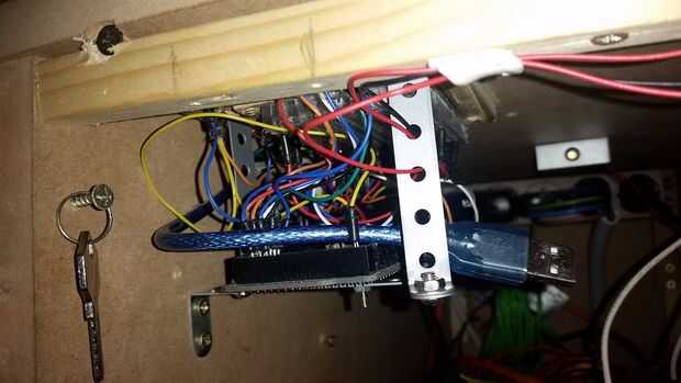 Si Monte la pieza de madera un poco más el la superficie de la mesa se puede añadir una cubierta para su electrónica. Simplemente puede hacer esto con un pedazo de MDF (2,5 mm) que es ligeramente más grande que el espacio en su escritorio. Y con una pequeña bisagra