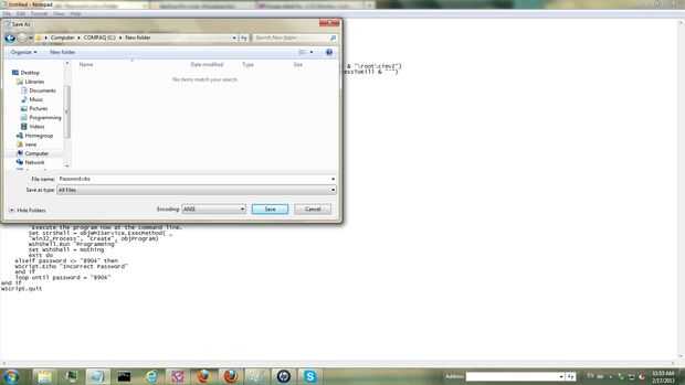 Ahora, guarde el archivo como Password.vbs. Asegúrese de que el guardar como tipo está establecido a todos los archivos.