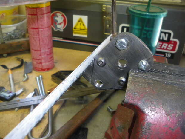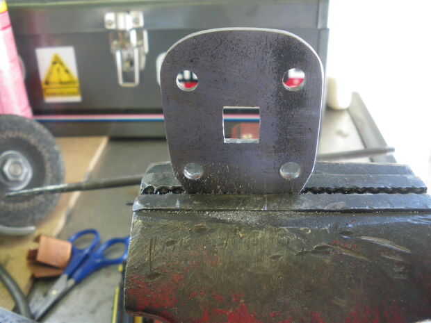 Bueno, los extremos. Cuatro agujeros de 1/4 para los pernos. De agujeros de dos 3/8"(uno para el grillete y el otro lo juntas de la plaquitas hice para poder unir las dos con un perno para darles forma con la sierra/inapropiada. Usé una combinación de una para de sierra de metal y una lijadora de banda para dar forma a las plaquitas. El agujero de 3/8" probablemente no sea necesario.