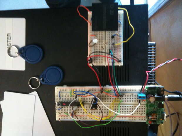 El lector se coloca en el exterior de la puerta y es independiente del controlador en el interior para que no se puede eludir la seguridad rompiéndose abierto al lector y tratar de corto circuito al lector. El controlador recibe los datos serie del lector y controla RGB led y la cerradura de la puerta. En este caso he puesto tanto en tableros de pan separado para la prueba. Aquí está un vídeo resumen del sistema en acción leer en ver cómo construir uno para su auto!