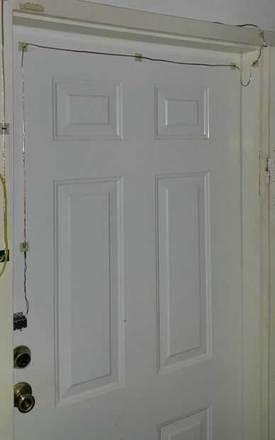 Independientemente de la cerradura o pestillo de la encaminamiento del alambre que es bastante habitual. Mi puerta es sólida por lo que no tenía ninguna opción pero al enrutar el cableado externamente en la sala.