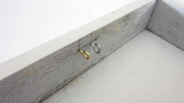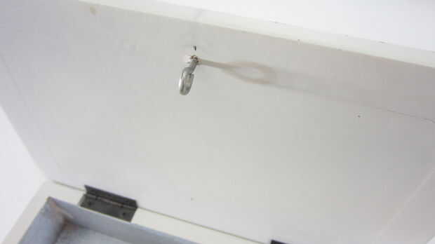 Para bloquear la caja, estoy utilizando un tornillos de tres ojos y un pasador de bloqueo. Dos tornillos de ojo están montados en el interior del panel frontal de la caja. Un tornillo del tercer ojo se monta en el interior de la tapa de la caja. Cuando la tapa esté cerrada, alineen los agujeros de los tornillos de ojo. La caja está bloqueada mediante la inserción de un perno a través de los tres orificios mientras que se cierra el cuadro. La caja es desbloqueada retirando el pasador.