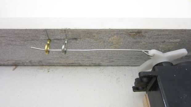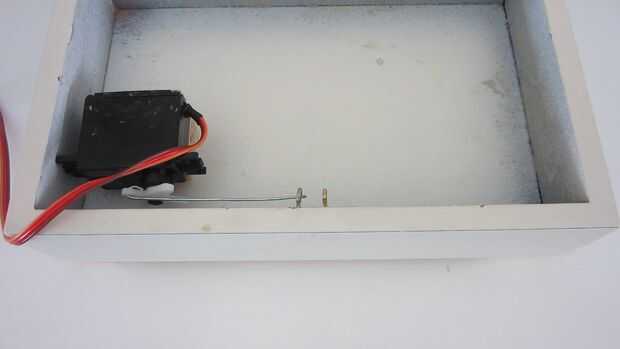 El pin es un simple trozo de alambre de acero (clip enderezado). Se mueve por el servo. El cable se une al servo en uno de los agujeros en el cuerno del servo (brazo del actuador).