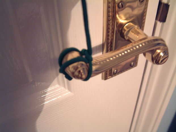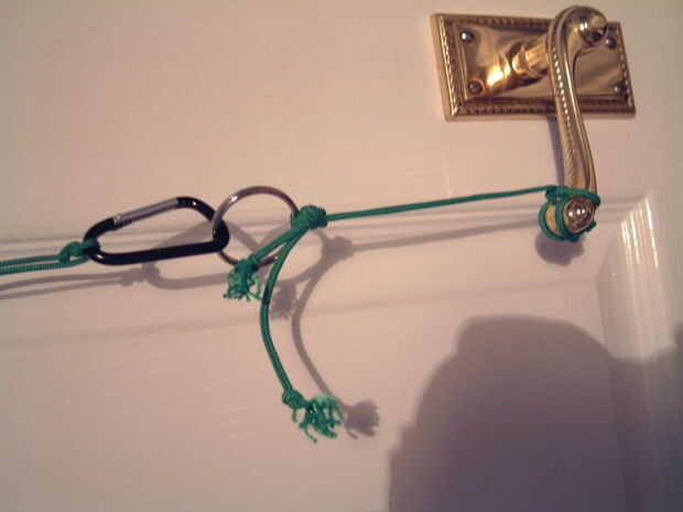 Primero, corte una longitud de cable de aproximadamente 12 "de largo y doblar en media, luego atar un nudo en el extremo doblado, dejando un bucle sólo lo suficientemente grande como para caber al final de la manija de la puerta a través de. Esto Coloque la manija con el nudo en la parte inferior, luego levante los dos extremos sueltos sobre el poco bultos en el extremo de la manija y métalos en la parte superior del bucle. ponerlos a través del lazo y tire hacia arriba y luego el cable debe estar conectado al extremo de la manija.