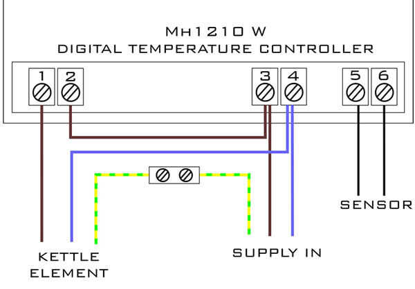 Los termostatos o debo decir "Controladores de temperatura Digital MH1210W" parece que funciona bien, pero mantener un ojo en la temperatura de la conmutación, pueden ir sobre o bajo unos cuantos grados (histéresis) si el sensor no está guardado en el flujo. También he añadido un esquema de cableado ya que he tenido les entrega sin un diagrama. Los pines 1 y 2 son para la conmutación actual del elemento. Los pines 3 y 4 son alimentación (220-240v) en y 5 y 6 son para el sensor de temperatura. Se necesita un conector separado para la tierra como uno no se proporciona en el controlador.