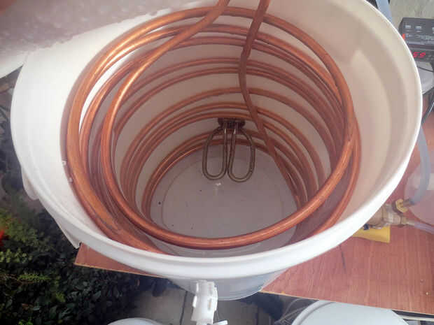 Ignorar el refrigerador poco por ahora, queremos hacer circular agua a 66C a través de nuestro grano, escalofriante viene más adelante!. Tome 10 metros de tubo microbore cobre de 10mm, llegará cola de espera para la mayoría de la duro poco se hace. Cuando "alineado" mi bin (ver foto) tuve que apretar los lazos un poco. Esto puede ser más incómoda y mucho jurar es necesario pero no es tan difícil. A continuación coloque un elemento de la caldera (no cerca de la parte inferior del recipiente) y un grifo, teniendo cuidado de no para perforar el tubo.