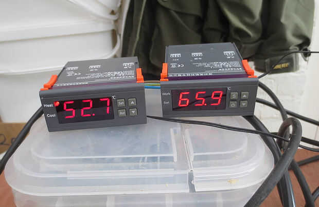 Se establece ahora, conecte la bobina de cobre a la salida de la bomba y el retorno de la bobina a un agujero en el centro de la tapa de cubo de puré. Una vez lleno el contenedor de calentador de agua encienda el elemento de la caldera y ajuste el termostato a 66C. Poner el sensor por el lado de la papelera de puré por lo que es en el "sumidero" junto a la entrada de la bomba. Llenar la Cuba de puré con aprox. 10 litros de agua y encienda la bomba. El intercambiador de calor traerá el agua circulando por el puré de bin a 66C, la temperatura recomendada de trituración. Punta, realmente puse la temperatura a 70C antes de agregar el grano que esta acción trae la temperatura baja unos grados. No se olvide de restablecer a 66C aunque una vez que se agrega el grano!