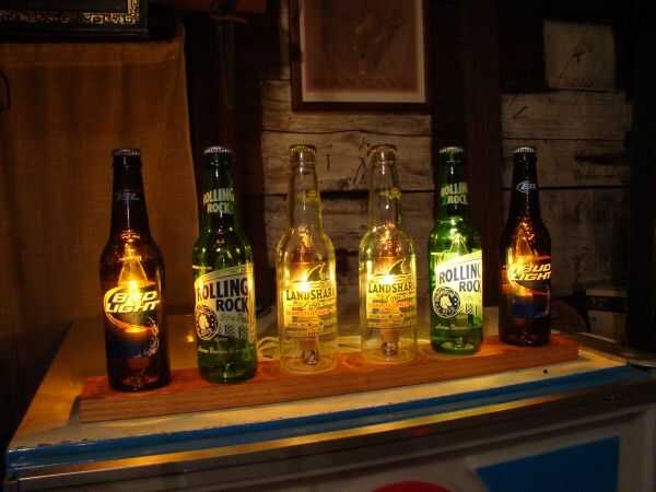 Así que decidí poner luces en algunas botellas de cerveza y montar a una base de madera. Yo no sé de donde provino la idea de conectar el proyecto a un órgano de color, o cómo cambió de una cadena de luces a un bulbo grande, pero creo que resultó agradable.