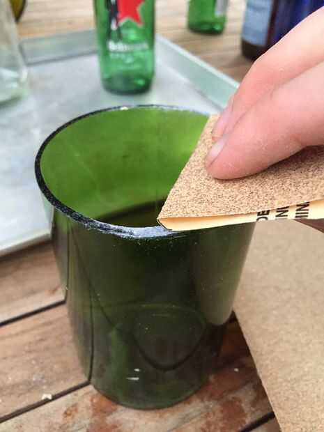 Pulir los bordes del vidrio usando papel de lija en la gama del grano 80-120. Que puede hacer una variedad de herramientas, pero lijar mano está bien.