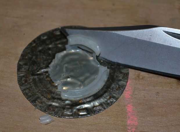 con un cuchillos quitar el plástico del interior de la tapa, luego aplanar nuevamente sobre una superficie dura.