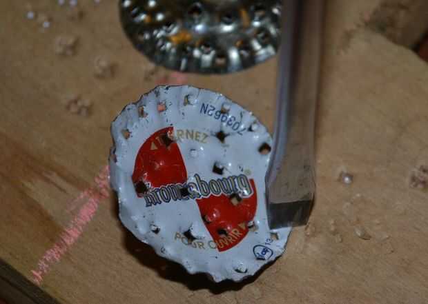 tengo un excedente de tapas de botellas que la gente me da para hacer jewlrey de (instructble pendiente) y como me estaba haciendo una nueva placa de metal para mostrar fotos en, y pensé estas cápsulas extra haría grandes imanes y fue sorprendido en