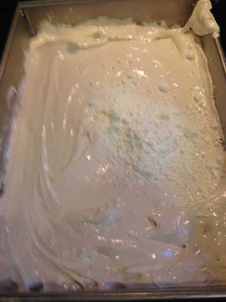 Igual que el polvo el 9 x 13 pan antes, toma un puñado de azúcar y ponerlo sobre el malvavisco. Mueva la sartén alrededor para que ejecute el azúcar toda la superficie y eliminar el azúcar de sobra.