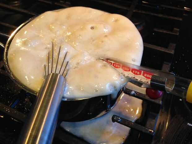 El objetivo de esta etapa es conseguir la mezcla 240F. No se hace el caramelo si no consigue a 240F en algún momento de la cocción. Después de que sea en 240F, estás listo para el siguiente paso (poner en la batidora con la cerveza y gelatina).