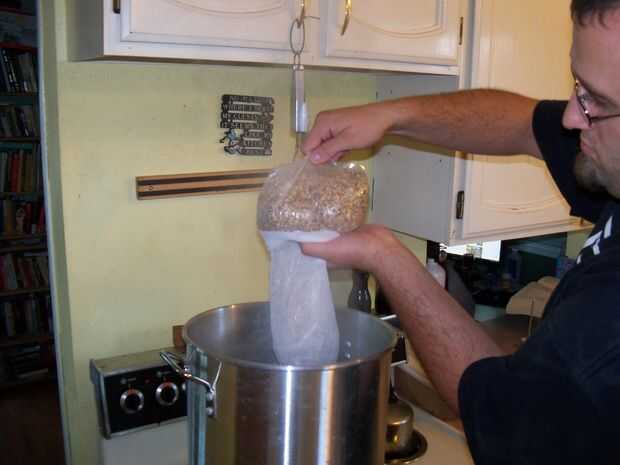En la olla grande, poner la temperatura de un galón o menos de agua hasta de 170F (aproximadamente 75C). Poner sus granos en un calcetín (una bolsa de algodón diseñada para la elaboración de la cerveza) y puesto que en el bote, entonces. La adición de los granos debe reducir la temperatura general del agua a alrededor de 150F (aproximadamente 65C), donde debe reposar unos 30 minutos.