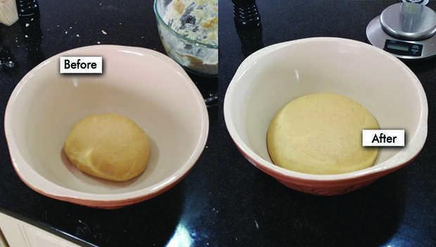 Cuando se amasa la mezcla, colocar en un bol, cubrir con un paño húmedo y reservar para una o dos horas. Hasta que la mezcla se ha duplicado en tamaño.