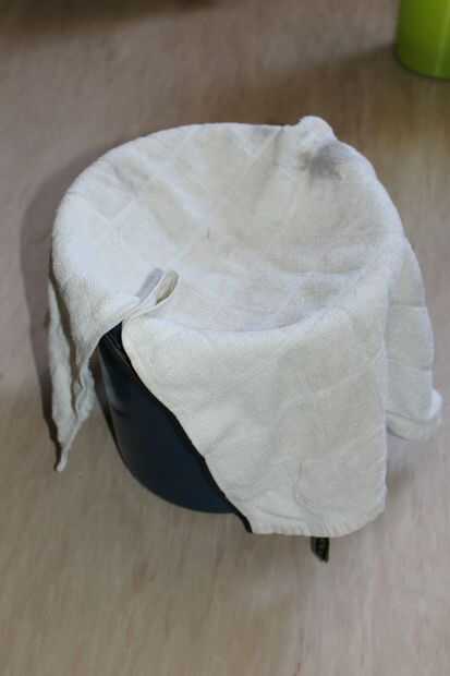 Coloque un trozo limpio de tela sobre el segundo cubo como en la foto y pedir a otra persona para sujetar firmemente en su lugar. Ahora Vierta lentamente la mezcla a través de la tela para quitar todas las partículas de la cerveza de jengibre. Tenga cuidado de no echar demasiada cantidad de la mezcla a la vez, porque la tela puede causar una acumulación de líquido y no quiere derramar.