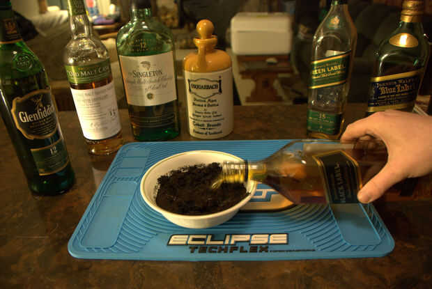 - Vierta su marca favorita de whisky (o whisky) sobre las virutas.
