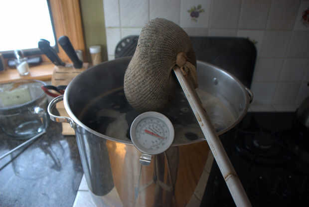 Traer 5 galones de agua a 160 grados F. No quieres ir cualquier más caliente que 160F como que suelte taninos, que le dará a la cerveza un sabor astringente amargo y serán una experiencia más desagradable de beber.