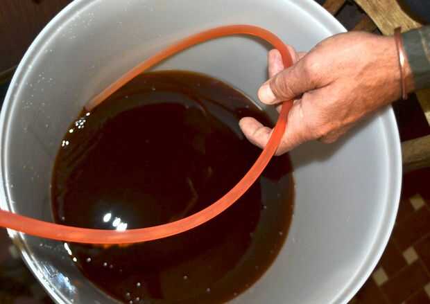 Verter la cerveza de un cubo a otro, con la manguera (aspirar el aire fuera de ella y tener un cubo alto y uno abajo). Dejar en la parte inferior algunos sedimentos, por lo que la cerveza será más transparente. Hacerlo con cuidado, especialmente a través de la parte inferior, para no recoger el sedimento (Coloque la manguera casi horizontal, ver dibujo).