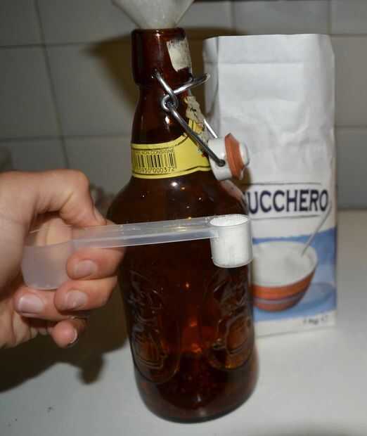 Poner una cucharadita de azúcar en cada botella de espumante. Vierta la cerveza en la botella, no hacer la botella llena completamente, dejar al menos 3 cm del cuello. Agite la botella un poco para hacer el azúcar derretido.