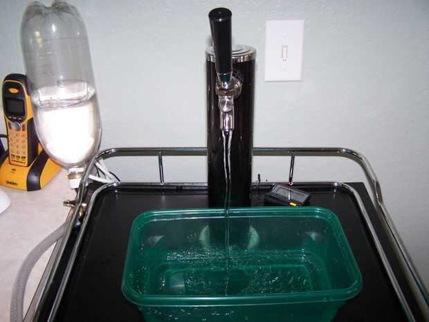 Ahora, usted puede limpiar la línea de cerveza con cualquier régimen que utilizas normalmente, o como se indica por la línea de cerveza solución de limpieza. Cuando abres el grifo, la solución en la botella a presión fluye a través de las líneas y la grifería. Después un pequeño flujo, cierre el grifo y deje la solución reposar en la línea de 10 o 15 minutos. Después de empujar toda la solución a través de, enjuague la línea varias veces con agua. Cuídate cuando la botella se vacía, como la llave de agua salpicará cuando el líquido se ha ido.
