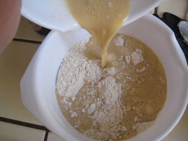 2 en otro recipiente, mezclar huevos, cerveza, leche y mantequilla derretida