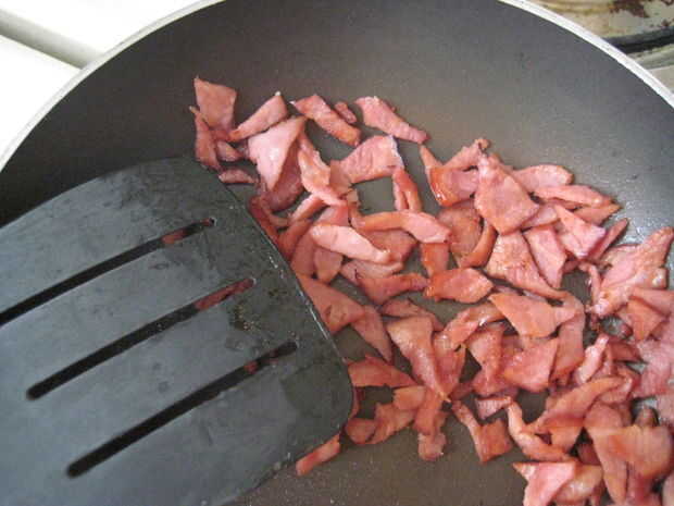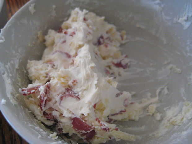 1. cortar el tocino en trozos pequeños y cocinar hasta que estén dorados. 2. picar 3 dientes de ajo en trozos pequeños. 3. Mezcle el tocino, queso crema, queso desmenuzado y trozos de ajo en un tazón grande.