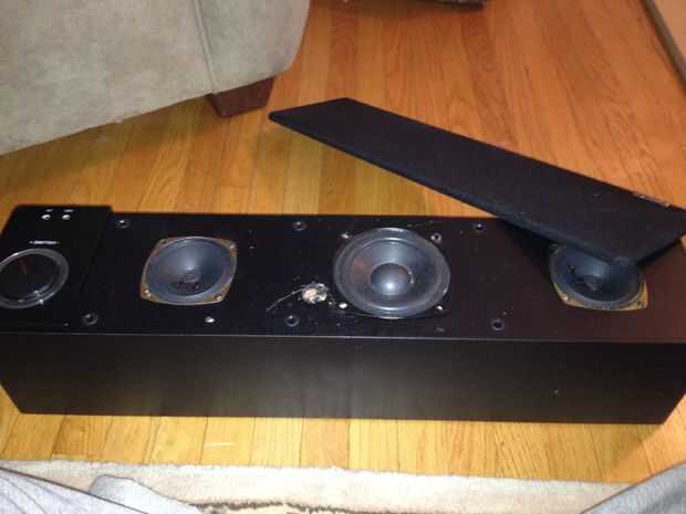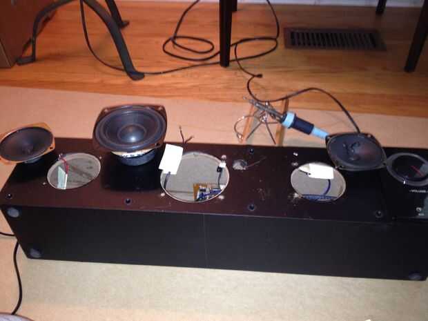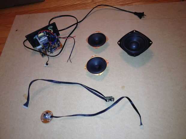 aquí es donde comienza el verdadero trabajo. tomar el sistema de sonido 2.1 surround y aparte con un destornillador y un set de cortadores de alambre. no importa si se daña la caja de altavoz/electrónica original debido a que no se necesitan. el sistema de sonido envolvente todo-en-uno compré vino con la electrónica desmontable del amplificador principal. (puede usar cualquier tamaño de sistema con cualquier número de altavoces, sólo elegí un 2.1 para la simplicidad)