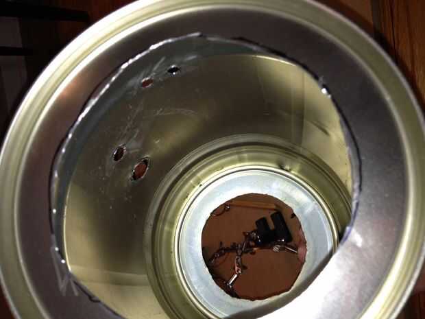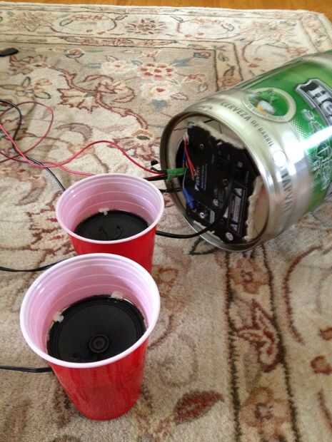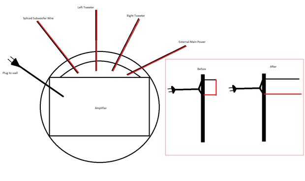 Corte los orificios de tamaño necesarios para el sub, perilla de volumen, entrada auxiliar y subwoofer. así como un gran agujero en la parte inferior para el amplificador principal caber en como se ve en las fotos. Suelde los cables del interruptor de eje de balancín y sub woofer. Conecte cables de volumen y los alambres de entrada AUX. amplificador. Cortar uno de los cables de alimentación a la red y conecte dos cables como se ve en el esquema debajo de cada uno de aproximadamente 4 pies en length.splice subwoofer de alambre y agregar un conjunto de cables sobre la misma, necesitará tanto de ésos más adelante.