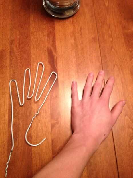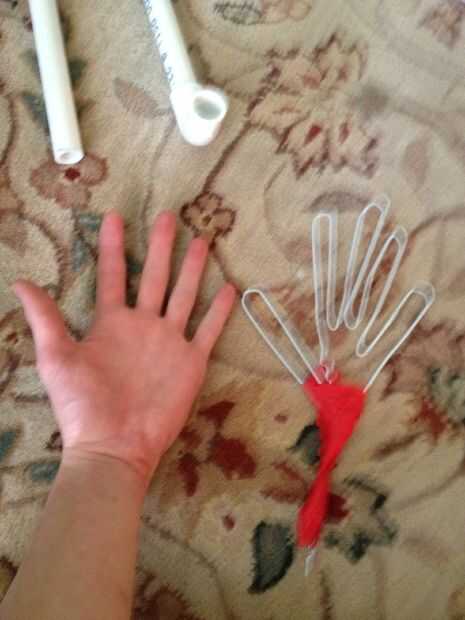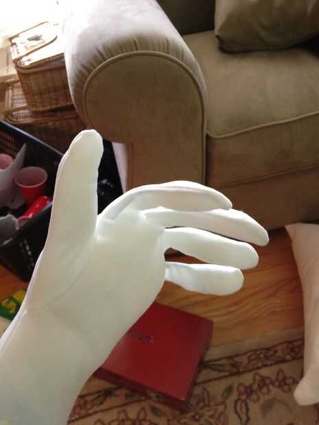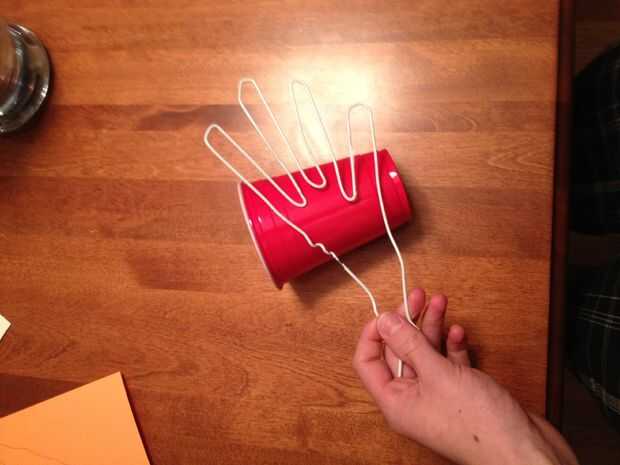 Traza tu mano en un pedazo de papel y doblar unos ganchos en forma de mano. luego coloque la parte inferior (muñeca) de las suspensiones para que sea una mano. a continuación tome el guante blanco y gire para llenar los dedos con un algodón, luego vuelta a la normalidad e insertar la forma de la mano que hizo. a continuación rellenamos el guante (con la mano dentro de ella) con más algodón para hacer la palma de la mano. el siguiente paso es doblar el cable interior del guante para sostener una taza roja.