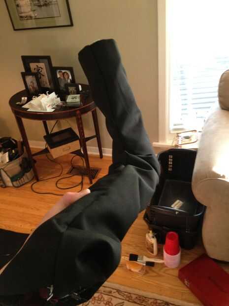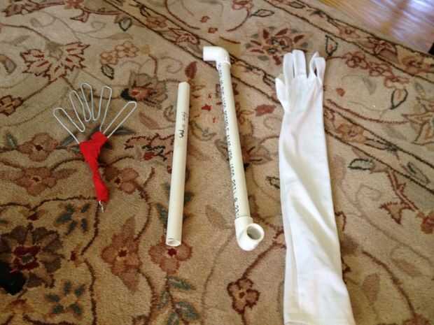 para hacer el brazo eche codos de 90 grados (2) y (2) 15" PVC piezas. y los puso juntos en la configuración que se ve abajo. para que se vea realmente como un brazo, conseguir una camisa de manga larga vieja o traje chaqueta y cortar el brazo de la y ponerlo sobre la parte superior. llenarla con algún algodón de una almohada vieja para darle cierta dimensión.