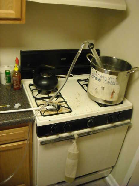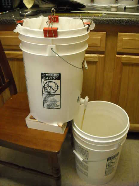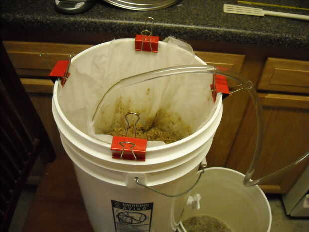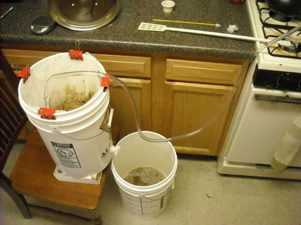 Entonces usted debe dejar el mosto drene hacia fuera el primer cubo. Necesita a las Naciones Unidas-clip de la bolsa, la recogida y muévelo alrededor un poco. Cuando es drenado completamente, cerrar el grifo y el valor de la descarga sobre el grano y luego déjela escurrir otra vez. Mientras tanto, calentar el agua de aspersión, que debe ser 1.5 veces su puré agua original, a unos 150 grados y luego rociar lentamente sobre la parte superior del grano usando el sifón. Cuando el líquido ha drenado en su segundo cubo haya terminado.