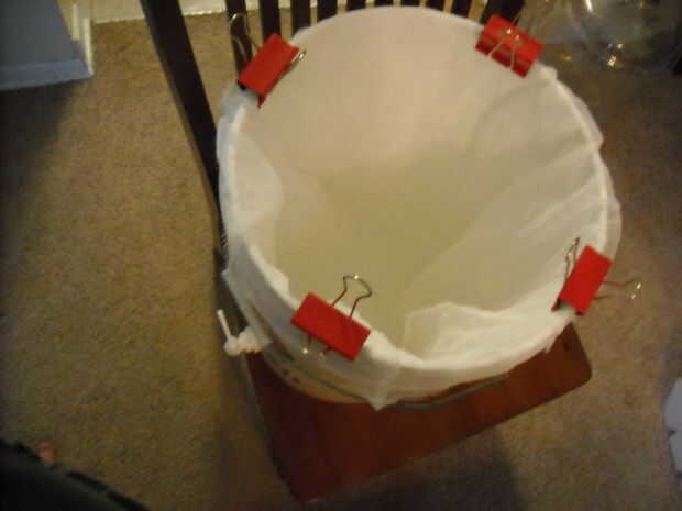 Aspersión es el proceso de enjuague el azúcar de los granos. El líquido resultante es la hierba. Primero fijar el cubo de aspersión (el uno con el agujero) conectando la espita y colocar la malla en el interior, sostenido por los clips de la carpeta, con el otro cubo debajo para recoger el mosto. (Lo probé sin clips de carpeta una vez y no funcionaba muy bien).