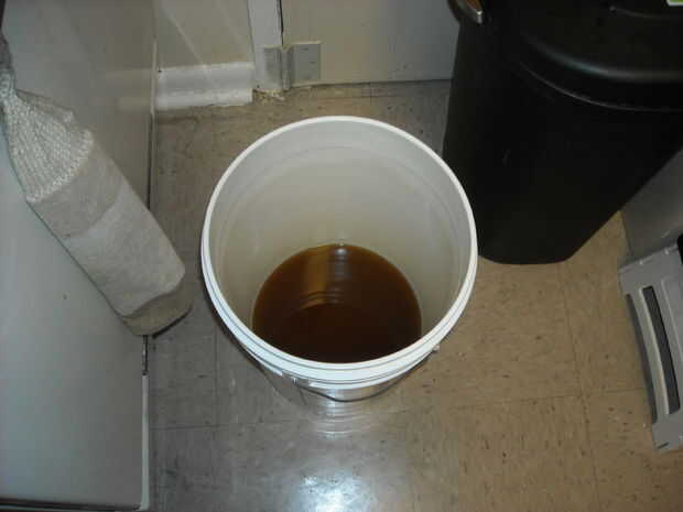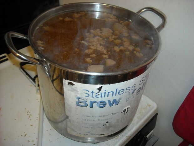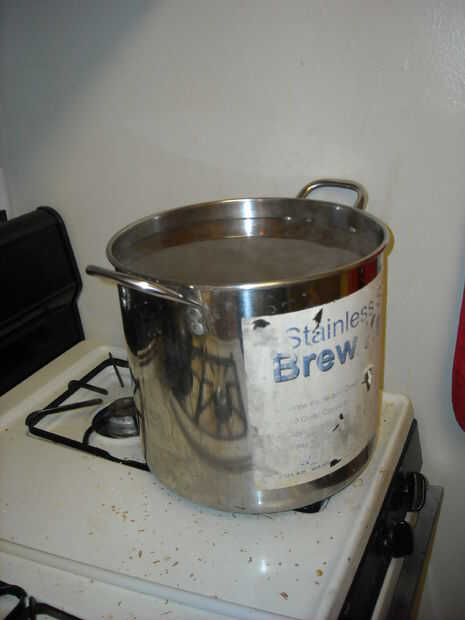 Volcar el mosto en la olla, añadir unas gotas de fermcap si desea, (Esto evitará que el mosto hirviendo y crear un caos impío) y calentar hasta hierva. Deje que la hierba solo vapor y hervir durante un rato hasta suficiente forúnculos de que estás en el volumen deseado, 5 galones en este caso. (Tuve que añadir mi hierba en lotes y deje algunos hervir antes de añadir más porque necesito una maceta más grande).