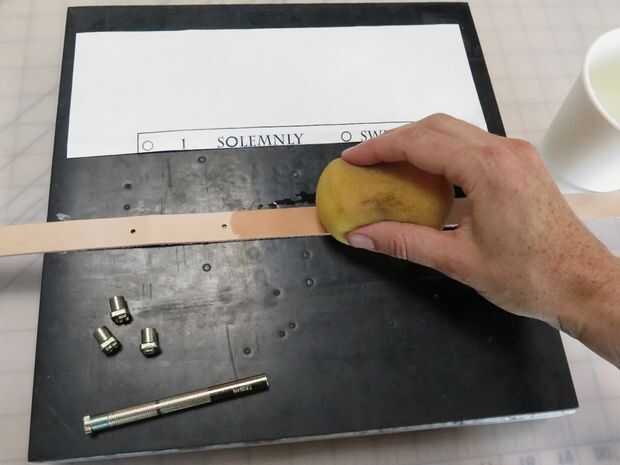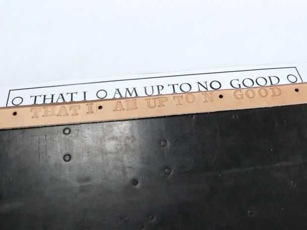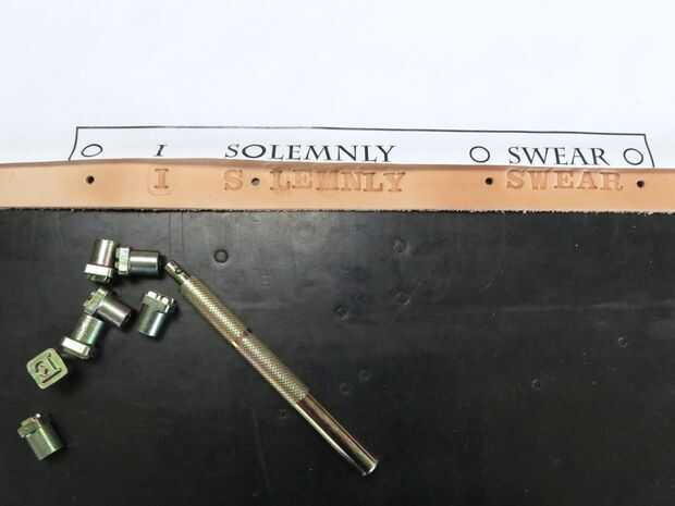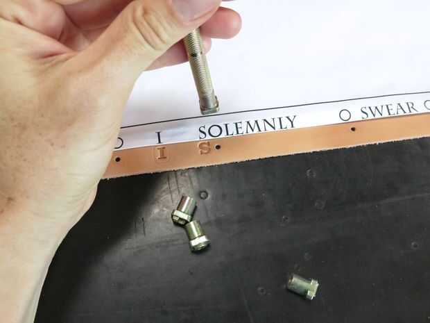 Antes de estampar, moje (o "entubado") mi piel con una esponja, esto hace que sea más suave por lo que aceptarán las impresiones de sello más eficazmente. Entonces usé un martillo golpear mis sellos de letra en mi piel. Esto fue hecho aún más complicado de lo que esperaba. Sabía que sería difícil conseguir las letras en una línea recta pero pensé que la impresión salidas solucionaría ese problema. Ayudó sin duda a y me dio algo a los sellos con, pero todavía tenía muchos problemas para hacer que las letras se vea aseado. Incluso estampado un par de ellos boca abajo por accidente, lo cual es fácil de hacer porque no puede ver la orientación de las cartas de la parte trasera. Era capaz de suavizar estos errores y vuelva a marcar, pero los resultados no eran muy aseados de como yo esperaba, tuve que abrazar el error porque no tengo ninguna más correas.