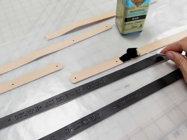 Para teñir mis cintas negras, que había trazado en papel de cera y utiliza un dauber lana para Waterstain Pro negro se aplica a la piel. Decidí que quería mantener los bordes de las tiras crudas, así que me sólo aplicar colorante a la superficie de la piel.