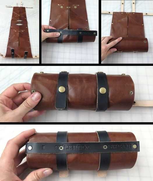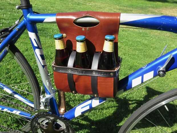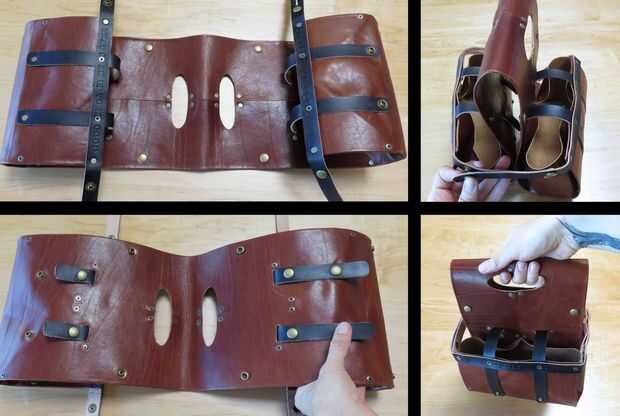 Para ponerlo en modo de llevar la cerveza, deslice las correas por las ranuras y presione hasta que quede como se muestra en la foto, dejando un espacio entre las capas de cuero marrón donde irá la cerveza. Entonces llegar y sacar las capas internas de la piel para pop-up y cajas de forma que la cerveza. Ajustar las correas horizontales alrededor de los extremos de la compañía y cierre los dos broches de presión cerca de la manija para sostener todo junto. Si está conectando a su bicicleta, ganas de hacer estas dos cosas hasta que han puesto el portador sobre la barra de la bicicleta.