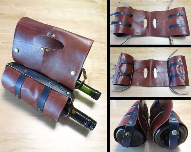 Para poner en vino con modo, deslice las correas por las ranuras de la misma y tire de ellas en la medida en que van a ir, uniéndolas a la parte inferior encaje. Esto crea un tubo en cada lado que mantendrá el vino. Las tiras horizontales en un extremo tienen cortes en ellos, rápido estos hasta los broches de presión en la parte inferior de los tubos de cuero. Para obtener el vino, deslice las botellas de vino en los tubos y cuello de palo por las ranuras y, a continuación, coloque el segundo conjunto de correas horizontales alrededor de los otros extremos de las botellas. Adjuntarlo a tu moto la misma manera.