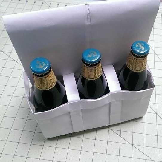 Tomé un pedazo grande de papel y experimentado con diversas maneras de doblarlo hasta que encontré algo que funcionó. Me las arreglé para llegar a un diseño que seguramente lleva 6 cervezas o dos botellas de vino, puede ser agregado fácilmente a una bicicleta, cómodamente llevada a mano y puede completamente desmontado y rodado en un librito aseado que se encaja a presión cerradas. No requiere de la construcción costura, y el patrón es sólo un simple rectángulo y 4 correas.