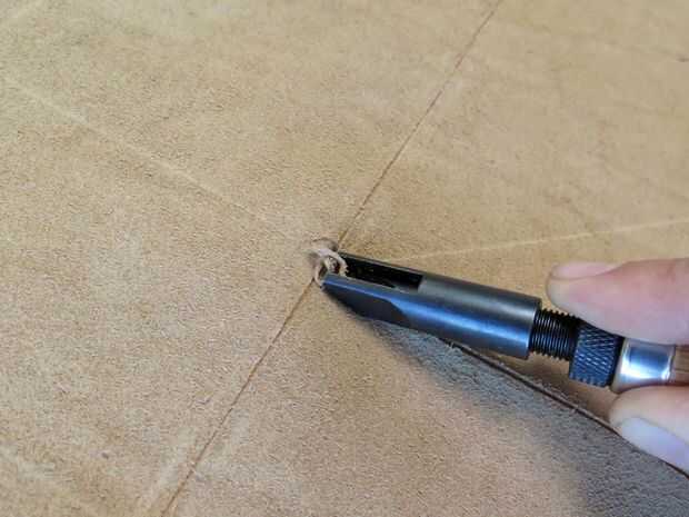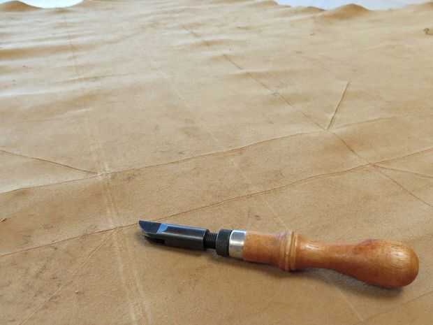 Cortaron mi pedazo de cuero hacia fuera, usé mi gubia V ajustable para anotar todas las líneas de doblez interno. Me aseguré que mi gubia fue fijado en muy poca profundidad y he probado en un trozo de mi piel en primer lugar para asegurarse de que no corte a través de todo el camino, o incluso cerrar. Este cuero es bastante flexible y no necesita demasiado el escopleo con gubia para doblar bien, pero un poco va un largo camino.