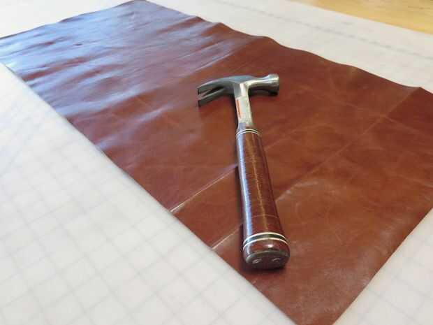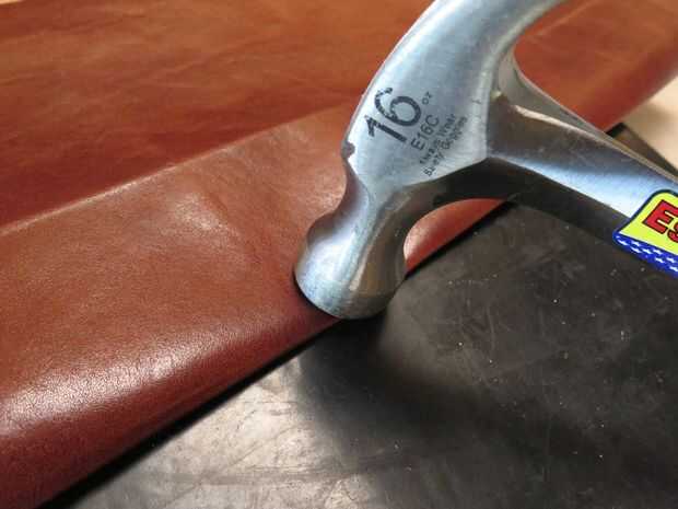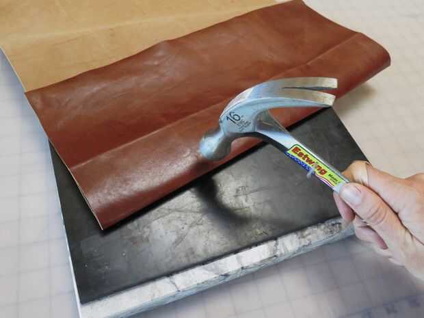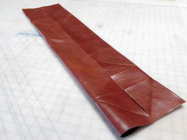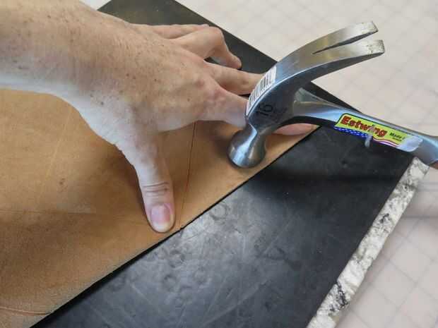 Tomé mi anotó rectángulo de cuero y doblado rigidez a lo largo de las líneas que había arrancado por golpear el borde del cuero doblado hacia abajo con un martillo. Devuelto a mi patrón de papel para ver qué dirección de doblar a lo largo de cada línea. Tuve cuidado de no golpear demasiado duro e Incline levemente el martillo para no dejar marcas en la piel. También podría evitarlo poniendo otro trozo de cuero sobre el pliegue y golpeando a través de eso.