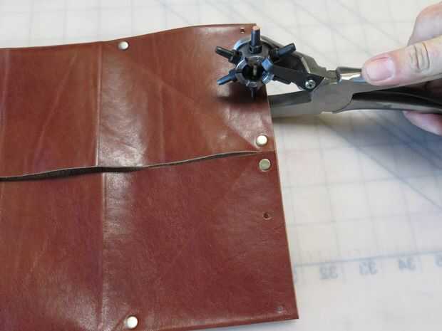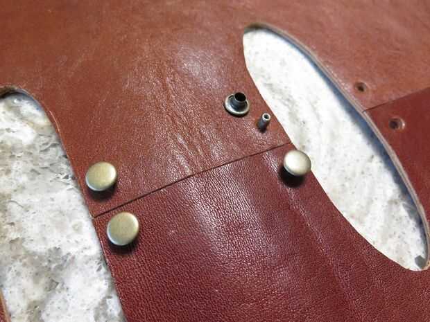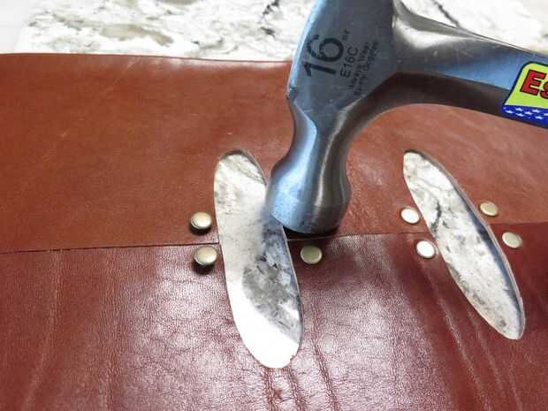 Os adjunto mi remaches con el extremo de casquillo suave hacia el lado de mi piel donde se encuentran los bordes plegados, porque esto es lo que en su mayoría serán visible. Los remaches que utiliza son remaches de ajuste rápidos, es decir que no necesita ninguna herramienta especial para pegarlas. Encontrar este tipo de remache muy conveniente y confiable para proyectos pequeños como este.