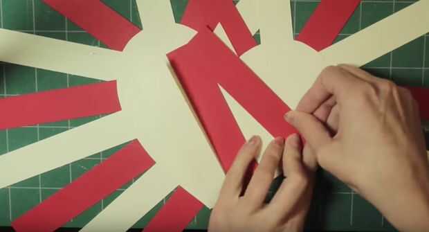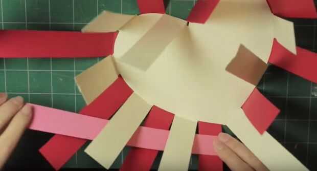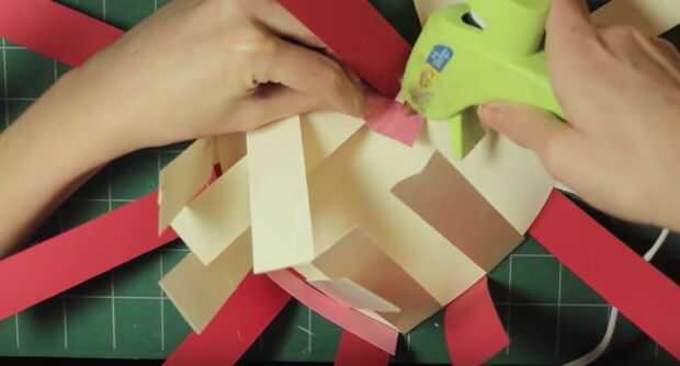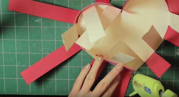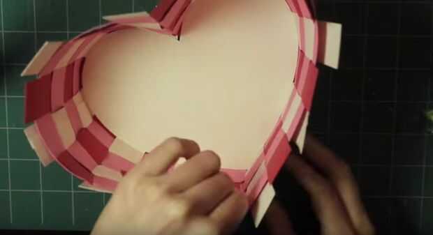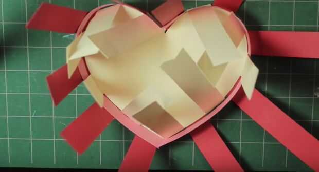 6. Tome un 11" pieza y empezar a tejer en un lado de la canasta. Ajustar para que quede con el corazón y pegar el extremo inferior a la última pieza vertical de ese lado. Doblar lo poco que sobra en la parte superior de la pieza hacia atrás, luego pegar a la pieza superior derecha vertical. Ir alrededor del corazón y pegar todas las piezas exteriores hasta la pieza en que sólo tejió.
