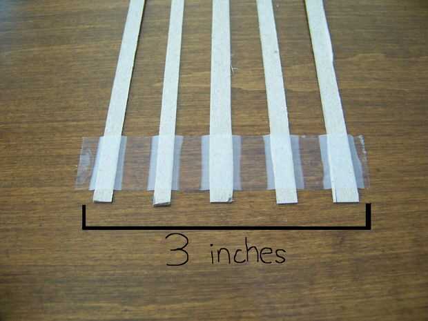 Tomar cinco de las tiras y colocarlos paralelos entre sí. La longitud de la primera tira a la quinta franja debe ser de tres pulgadas. Coloque cinta en ambos extremos de las tiras.