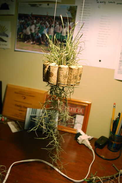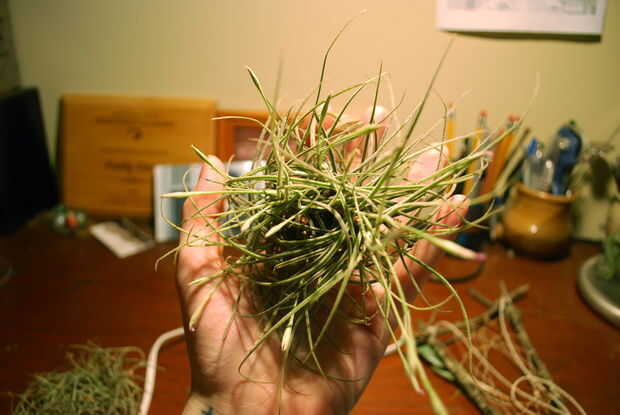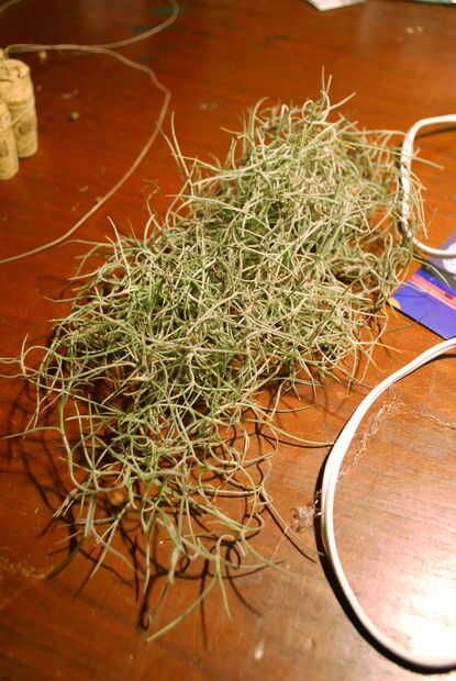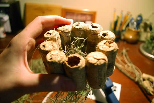 Tome la planta en forma de bola de aire y colóquelo hacia abajo dentro de la tapa de la cesta de corcho para que se sienta sobre el musgo español y derrames de que sus curiosas hojas sobre las copas de los corchos.
